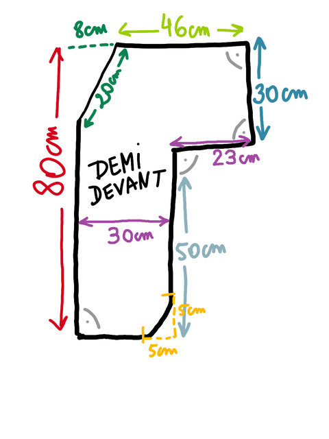 Pour commencer, il faut dessiner le patron du kimono: un dos (fait à partir de deux demi-dos) et deux devants. Pour ma part, je l'ai fait descendre jusqu'au haut de la cuisse et j'ai fait une longueur de manche trois-quart. Voici les mesures: