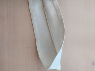 2) Posez les deux pièces l'une sur l'autre, endroit contre endroit. Épinglez à 1 cm le long des bords, en laissant libre le bord inférieur. Puis piquez à la machine. Crantez légèrement les deux angles pointus avant de retourner le col sur l'endroit :